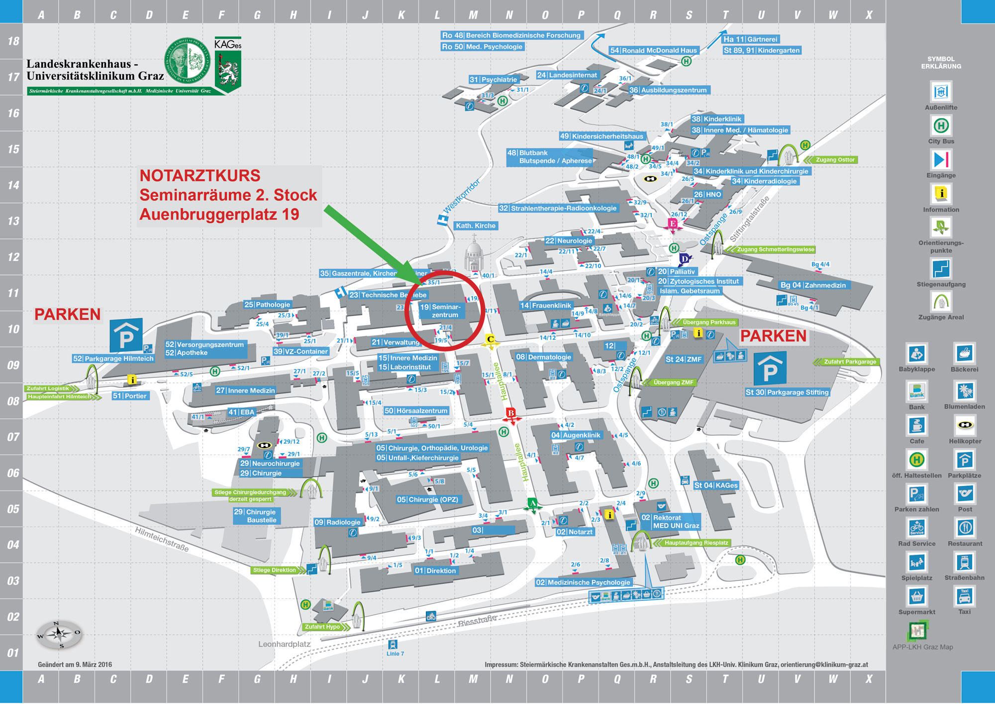 Sie gelangen mit der Straßenbahn Linie 7, Haltestelle St. Leonhard/LKH, direkt zum LKH-Universitätsklinikum Graz (Eingangszentrum LKH, St. Leonhard). Parken ist in der LKH-Besucherparkgarage (Stiftingtalstraße) zu einem Sonderpreis (Tagesticket dzt. EUR 8,-) möglich. Ermäßigungsticket zum Nachstecken erhalten Sie bei der Kursbetreuung (Fa. Conventa) vor Ort.